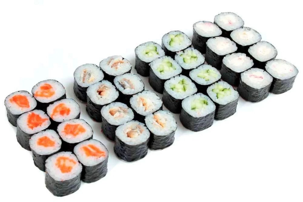 Ролл с авокадо, ролл с тунцом, ролл с угрем, ролл с тобико, роллы с лососем, ролл с курицей. Без творожного сыра и майонеза