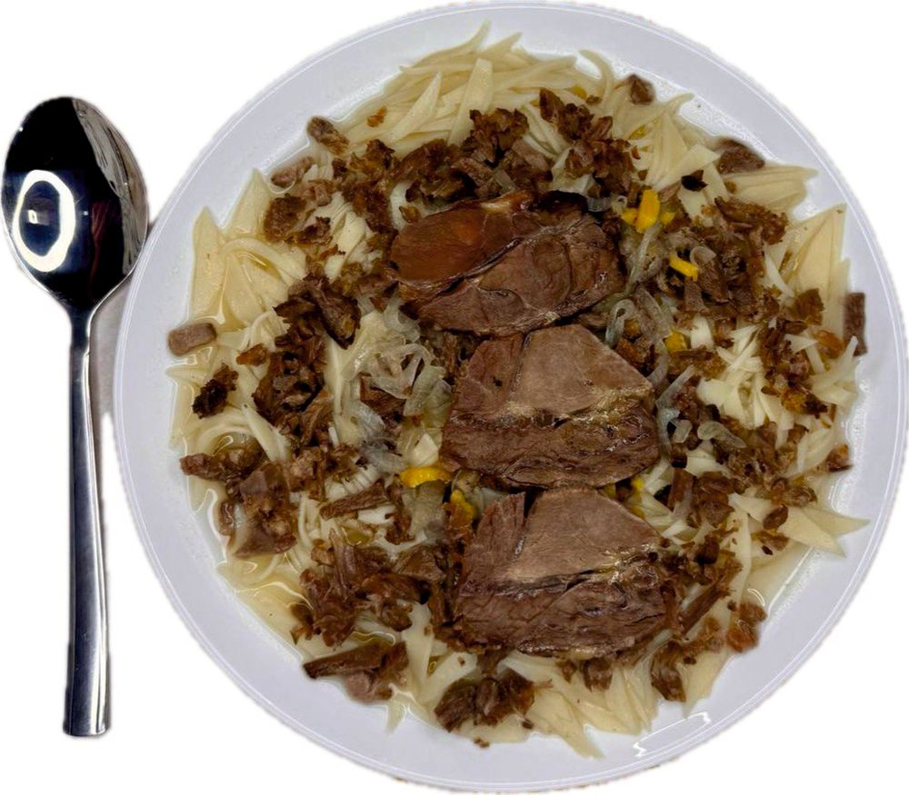 Говядина, бульон, кульчетай (резаная лапша), лук, казы из конины.