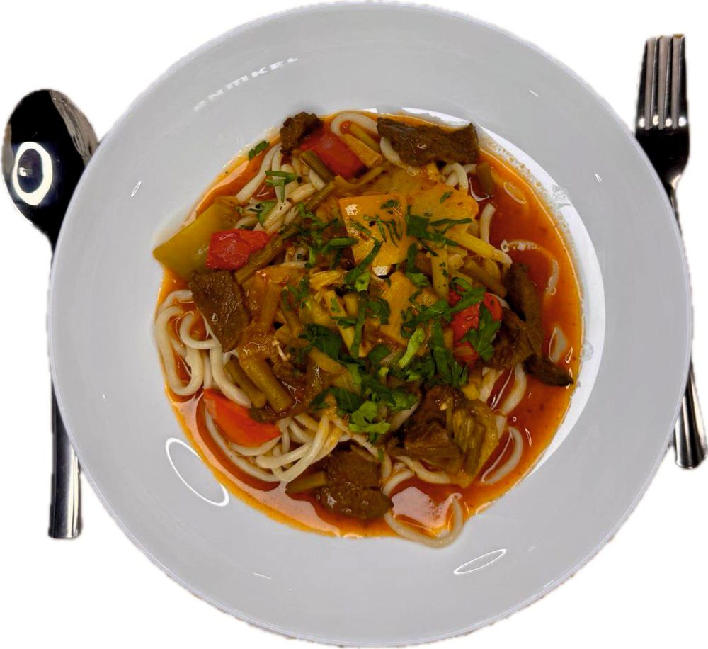 Домашняя лапша, говядина, перец болгарский, сельдерей, побеги чеснока, пекинская капуста.