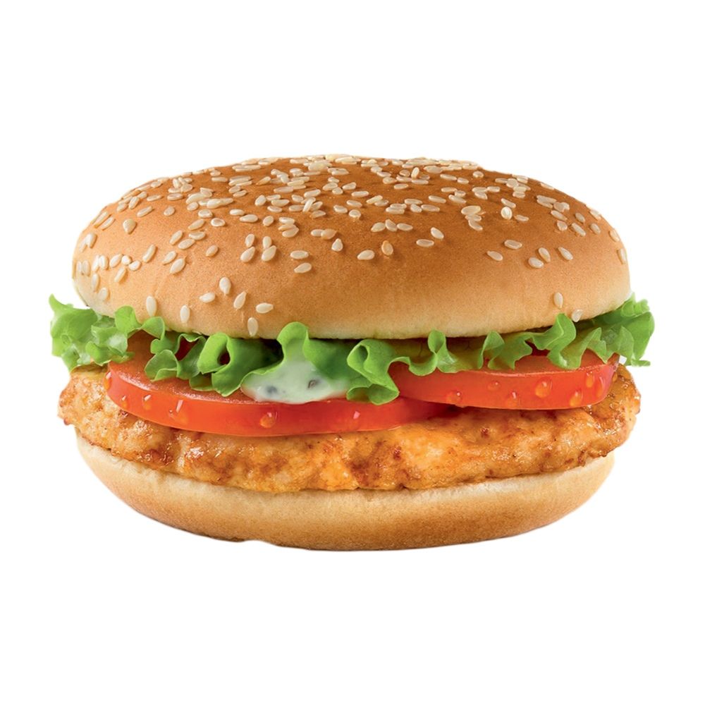Острый чикен, булочка,помидор, лист салата, фирменный соус