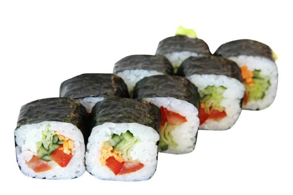 Нори, рис, творожный сыр, огурец, помидор, перец, лист салата.