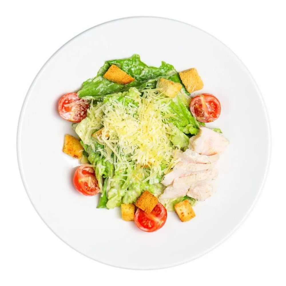 Листья салата, курица, черри, сыр пармезан, сухари, соус.
